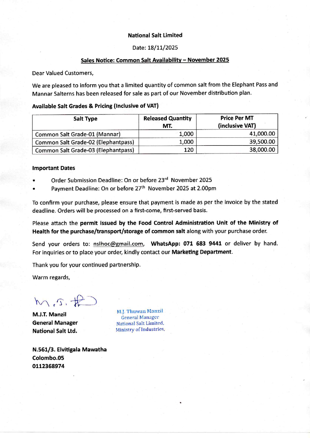 COMMON SALT AVAILABILITY - NOVEMBER 2025